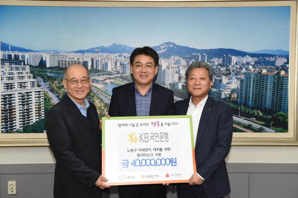 서울 노원구는 3일 구청장실에서 KB국민은행 북부영업본부로부터 미세먼지 방지용 보건마스크 4만개(4000만원 상당)를 기탁받았다. 사진은 이날 기탁식에 참석한 오승록 구청장(가운데)과 은행 관계자들이 기념촬영을 하는 모습. (사진제공=노원구청)