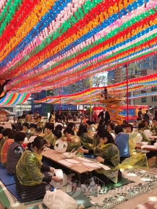 부처님 오신날(5월12일)을 한 달여 앞둔 8일 오후 서울 종로구 견지동 조계사에서 불자들이 연등을 만들고 있다.