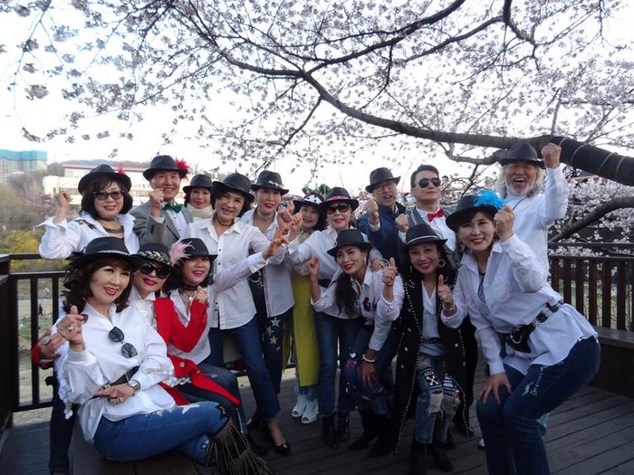 | ▲ 소남섭 예술 단장이 이끌고 있는 씨나예술공연단이 공연을 마치고 벚꽃을 배경으로 포즈를 취하고 있다. | ||