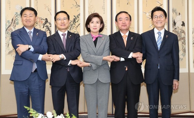 바른미래당 김관영(왼쪽부터), 더불어민주당 홍영표, 자유한국당 나경원, 민주평화당 장병완, 정의당 윤소하 등 여야 5당 원내대표단이 중국 상하이 한국문화원에서 열리는 대한민국 임시정부 수립 및 임시의정원 개원 100주년 기념행사에 참석하기 위해 10일 오후 김포공항 귀빈실 도착해 기념촬영 하고 있다.