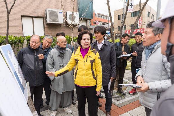 김수영 양천구청장이 10일 오후 2시 양천구 신월1동에서 열린 '찾아가는 현장구청장실'에서 곰달래꿈마을 주민공동이용시설 공사 현장에 방문해 공사 현황에 대해 질의하고 있다. (사진제공=양천구청)