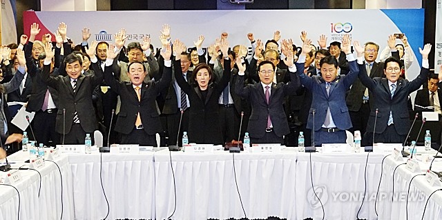 10일 중국 상하이 한국문화원 강당에서 5당 원내대표와 국회의원들이 1919년 임시의정원 첫 회의 재연 행사를 마치고 대한민국 만세를 삼창하고 있다.