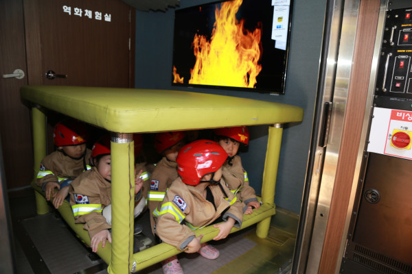 영등포소방서는 12일 오전 도림유수지에서 양평2동어린이집 등 100여명을 대상으로 이동안전체험 차량 119안전체험 교실을 운영했다. 사진은 어린이들이 역화체험을 하고 있는 모습. (사진제공=영등포소방서)