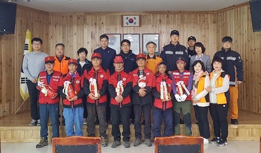 | ▲ ※사진설명:부곡119안전센터의용소방대와 부곡면 산불감시원들이 자매결연 기념촬영을 하고 있다. | ||
