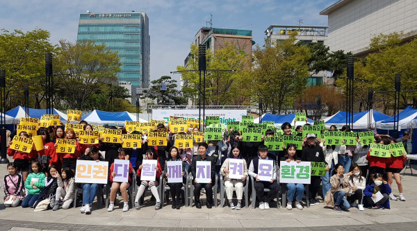 서울 성동구는 최근 청소년 어울림마당의 일환으로 왕십리광장에서 청소년 환경인권축제 ‘그린라이트(Green Right)’를 개최했다. 이날 환경과 인권을 주제로 다양한 체험 부스와 이벤트가 마련됐다. 사진은 청소년들이 기념촬영을 하는 모습. (사진제공=성동구청)