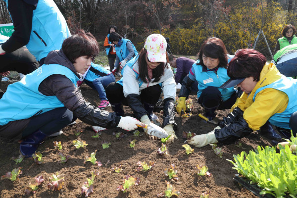 서울 관악구가 지난 12일 낙성대 도시텃밭에서 동 자원봉사캠프 상담가 및 자원봉사자 100여명 등과 함께 '든든해요! 엄마愛요' 자원봉사캠프 텃밭 개장식을 열었다. 사진은 자원봉사캠프 관계자 및 자원봉사자들이 상추 모종을 심고 있는 모습. (사진제공=관악구청)