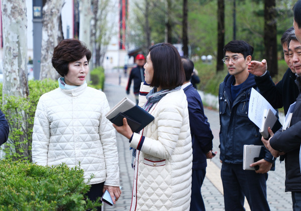 | ▲ 현장을 방문한 이성자 의장(오른쪽)이 구청 관계자들과 함께 문제해결을 위해 이야기를 나누고 있다. (사진제공=송파의회) | ||