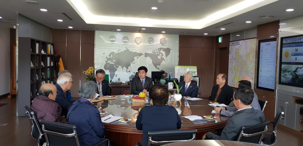 경기 수원시 장안구는 15일 오전 구청장 집무실에서 대한노인회 장안구지회장과 지역내 10개동 경로당 협의회장과의 간담회를 개최했다. 사진은 신태호 구청장이 참여자들과 이야기를 나누고 있는 모습. (사진제공=수원시청)