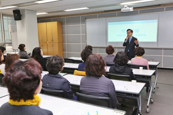 서울 금천구가 최근 ‘아동돌봄관리체계 종합개선대책’의 일환으로 아이돌보미 등의 보육종사자에 대한 ‘아동학대 예방교육’을 실시했다. 사진은 교육에 참여한 유성훈 구청장이 인사말을 하고 있는 모습. (사진제공=금천구청)