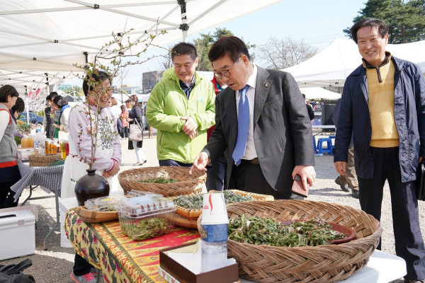 경기 광주시 퇴촌면 농촌중심지활성화 지역역량 강화사업의 일환인 농부장터 ‘촌(村)스런마켓’이 지난 13일 성황리에 개최됐다. 퇴촌면 광동삼거리에 마련된 행사장에는 신동헌 시장, 소병훈·임종성 국회의원, 안기권 도의원, 방세환·주임록 시의원, 시민 등 2000여명이 방문했다. 사진은 신 시장이 농산물을 살펴보는 모습. (사진제공=광주시청)