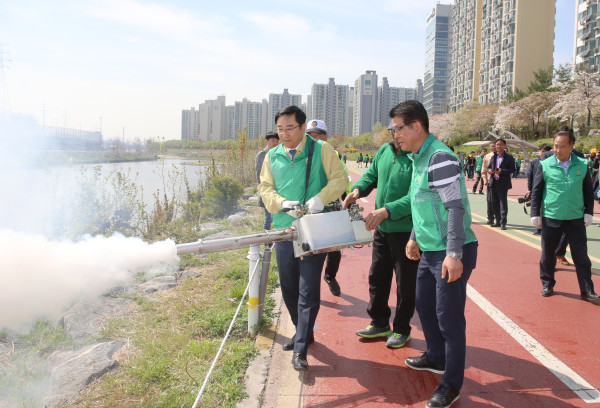 서울 도봉구는 지난 16일 중랑천변(서원아파트 105동 뒤)에서 ‘2019년 새마을운동도봉구지회 방역 발진식’을 개최했다. 발진식 후에는 방역차량 4대, 외발방역기 4대를 동원해 방역을 했다. 사진은 이동진 구청장(왼쪽)이 방역을 하는 모습. (사진제공=도봉구청)