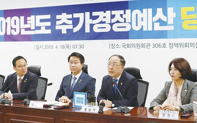홍남기 경제부총리 겸 기획재정부 장관이 18일 국회 의원회관에서 열린 더불어민주당 2019년도 추가경정예산 당정협의에 참석, 발언하고 있다.