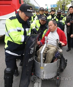 제39회 장애인의 날을 이틀 앞둔 18일 기념식이 예정된 서울 여의도 63빌딩 앞에서 전국장애인차별철폐연대 회원들이 장애인 거주시설 폐쇄법 제정 등을 촉구하며 도로로 나서 기습 시위를 벌이고 있다.