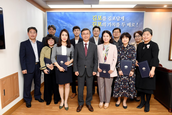 경기 김포시가 최근 인구정책위원회 위촉식을 열고 첫 회의를 개최했다. 이날 회의에서는 시 인구정책 해법 마련을 위한 다양한 의견을 제시했다. 사진은 위촉식 후 기념촬영을 하고 있는 정하영 시장(가운데)과 위원들의 모습. (사진제공=김포시청)