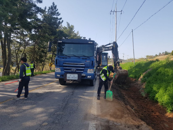 전남 영광군이 오는 5월3일까지 지역내 도로 260km에 대해 여름철 집중호우 대비 도로측구 정비 및 도로노면 퇴적 토사 제거 등의 춘계 도로정비를 일제히 실시한다. 사진은 지난 17일 도로정비를 하고 있는 군청 관계자들의 모습. (사진제공=영광군청)