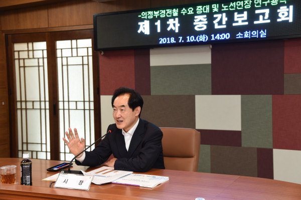 | ▲ 의정부경전철 수요 증대 및 노선연장 연구용역 중간보고회에서 안병용 시장이 발언하고 있다. | ||