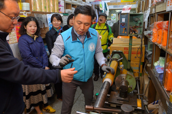 | ▲ 방산시장에서 상인이 절단가공을 시연하고 있다. (사진제공=중구청) | ||
