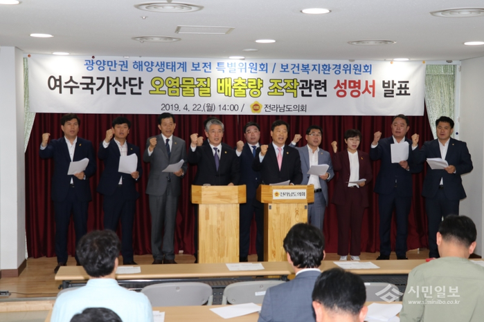 [남악=황승순 기자] 전남도의회 광양만권 해양생태계 보전 특별위원회(위원장 이광일, 여수1)와 보건복지환경위원회(위원장 전경선, 목포5)는 22일 도의회 기자실에서 최근 여수국가산단 사업장의 대기오염물질 측정값 축소 및 허위 성적서 발행에 대한 철저한 수사와 재발방지 대책 마련을 촉구하는 대정부 성명서를 발표했다.