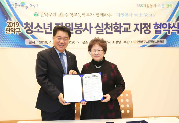 서울 관악구가 22일 삼성고등학교와 청소년 자원봉사 활성화를 위한 '2019 관악구 청소년 자원봉사 실천학교 지정' 협약식을 개최했다. 사진은 협약서를 들고 기념촬영을 하고 있는 박준희 구청장(왼쪽)과 윤민자 교장의 모습. (사진제공=관악구청)