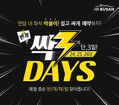 에어부산(사장 한태근)은 출발이 임박한 날짜의 국제선 항공권을 초특가로 구매할 수 있는 ‘번개 싹3DAYS(이하 ’번개 싹 쓰리DAYS)’ 프로모션을 정기적으로 진행한다고 23일 밝혔다.