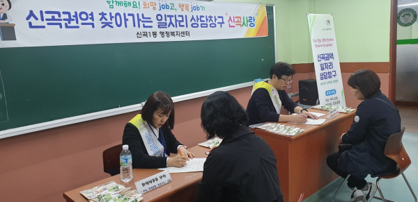 경기 의정부시 신곡1동 행정복지센터는 22일 의정부 중앙간호학원에서 교육 수료생 40여명을 대상으로 현장 중심의 일자리 상담 안내를 위한 ‘제2회 찾아가는 일자리 상담창구 신곡사랑’을 운영했다. 사진은 상담이 진행되고 있는 모습. (사진제공=의정부시청)