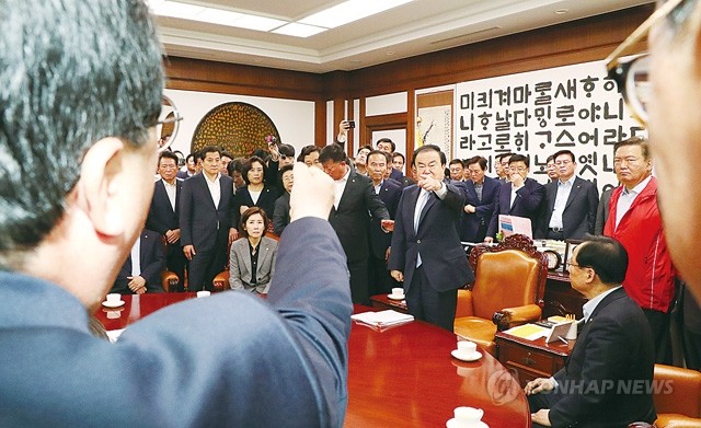 문희상 국회의장(테이블 오른쪽 두번째)이 24일 오전 국회의장실에서 선거법 개정 패스트트랙 지정과 관련해 항의 방문한 자유한국당 의원들과 설전을 벌이고 있다.