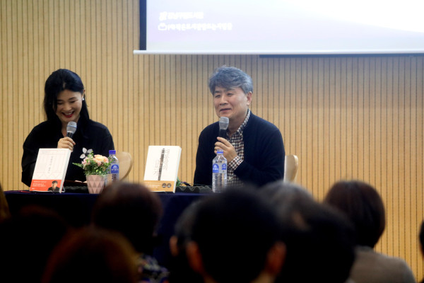 24일 오후 7시 강남구청 본관 1층 로비에서 열린 <대통령의 글쓰기> 강원국 작가의 '세상을 바꾸는 글쓰기의 힘!' 북 콘서트에서 강 작가(오른쪽)가 강연을 하고 있다. (사진제공=강남구청)