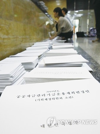 25일 정부 관계자들이 2019년도 제1회 추가경정예산안을 국회 의안과에 접수한 뒤 부처별 자금운용변경계획안 서류를 정리하고 있다.