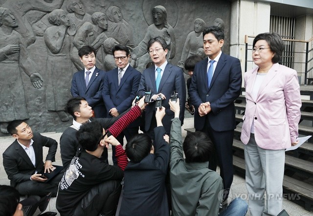 개혁법안 패스트트랙 적용에 반대하는 바른미래당 유승민 전 대표와 의원들이 25일 오전 문희상 국회의장이 입원 중인 서울 여의도 성모병원 앞에서 문 의장의 오신환 의원 사법개혁특별위원회 사보임 허가한 것에 대한 입장을 발표하고 있다. 왼쪽부터 하태경, 정병국, 유승민, 오신환, 이혜훈.