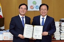김석준 부산광역시교육감이 25일 오후 4시30분 교육감실에서 이진호 한국전력공사 부산울산본부장과 ‘Iot(사물인터넷) 스마트 라운지 기증’ 업무협약을 체결하고 있다.