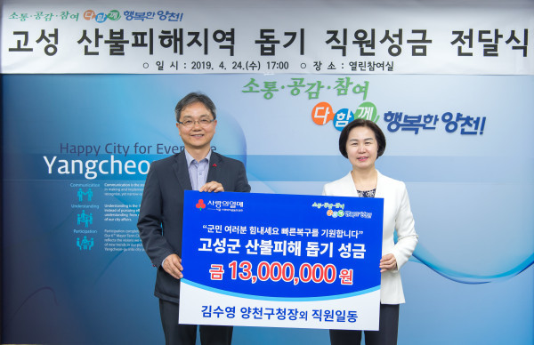 김수영 서울 양천구청장(오른쪽)이 지난 24일 양천구청 열린참여실에서 개최된 ‘고성산불 피해지역 돕기 직원성금 전달식’에서 성금을 전달하고 있다. 구는 전직원이 동참해 모은 성금 약 1300만원을 서울시 사회복지공동모금회에 전달, 고성군에 지정기탁했다. (사진제공=양천구청)