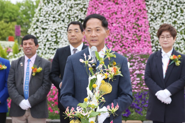 26일 ‘2019 고양국제꽃박람회’ 오프닝 행사에서 이재준 고양시장이 축하 인사를 전하고 있다.