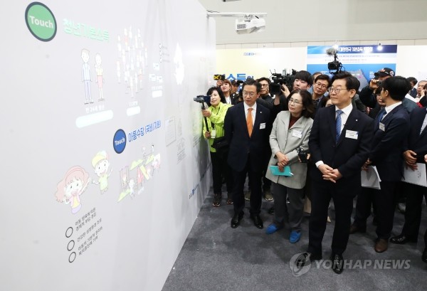 29일 오전 경기 수원시 영통구 수원컨벤션센터에서 열린 '2019 대한민국 기본소득 박람회'에서 이재명 경기도지사가 전시 부스를 둘러보고 있다.