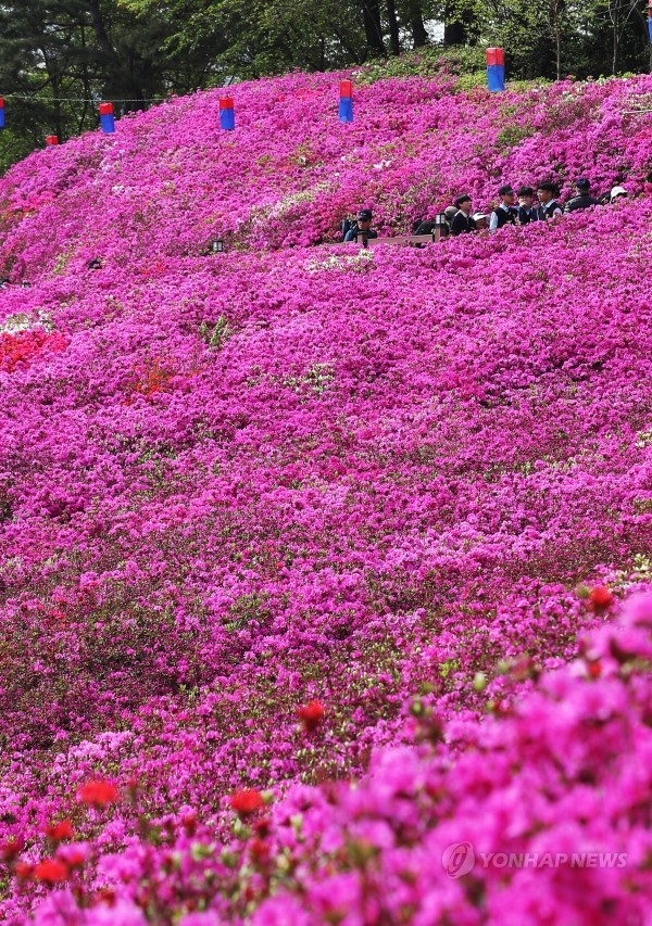 30일 오전 경기 군포시 산본동 철쭉동산을 찾은 시민들이 만개한 철쭉을 보며 봄기운을 만끽하고 있다.