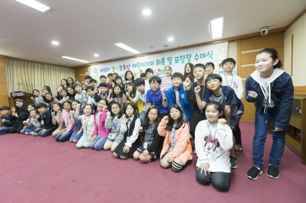 서울 강서구는 30일 구청 대회의실에서 강서구 어린이 소식지인 ‘강서꿈동산’ 제10기 명예기자 57명을 위촉하고 2018년 활동이 우수했던 8명에게 표창장을 수여했다. 사진은 위촉된 어린이기자들이 기념촬영을 하는 모습. (사진제공=강서구청)