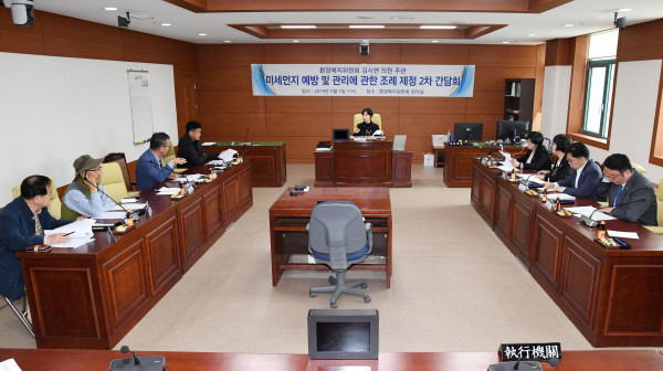 1일 울산시의회 의사당 5층 환경복지위원회 회의실에서 김시현 의원 주관으로 '미세먼지 예방 및 관리에 관한 조례 제정관련 2차 간담회'가 열렸다. 사진은 이날 간담회에서 조례와 관련한 논의가 진행되고 있는 모습. (사진제공=울산시의회)