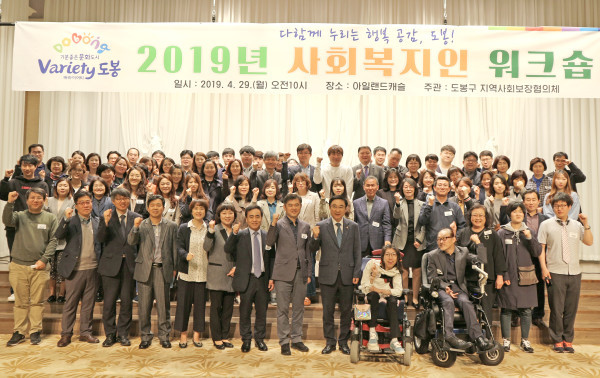 서울 도봉구는 최근 의정부 아일랜드캐슬에서 구 지역사회보장협의체위원 및 사회복지종사자 등 100여명이 참석한 가운데 ‘2019년 도봉구 사회복지인 워크숍’을 개최했다. 사진은 이동진 구청장(왼쪽에서 아홉 번째)과 참석자들이 기념촬영을 하는 모습. (사진제공=도봉구청)