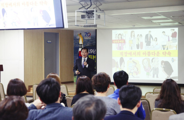 경기 수원시 팔달구는 1일 구청 대회의실에서 구·동 직원을 대상으로 직장내 성희롱 예방 교육을 실시했다. 사진은 김범일 경감(경기남부경찰청 현장강사)이 강의를 진행하는 모습. (사진제공=수원시청)