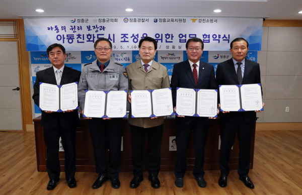 전남 장흥군은 장흥군의회, 장흥경찰서, 장흥교육지원청, 강진소방서와 지난 1일 군청 상황실에서 아동권리보장과 아동친화도시 조성을 위한 지역사회 유관기관 업무협약을 체결했다. 사진은 정종순 군수(가운데)와 유관기관 관계자들의 기념촬영 모습. (사진제공=장흥군청)