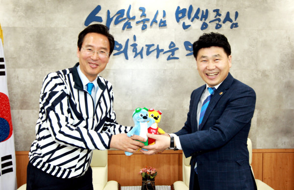 이날 방문은 오는 7·8월 개최되는 '광주FINA세계수영선수권대회'의 성공적 개최를 위해 시의회에서 대회 마스코트인 ‘수리·달이’를 전달하고 분위기 조성 및 참여 홍보 협조 등을 요청하기 위해 이뤄졌다.