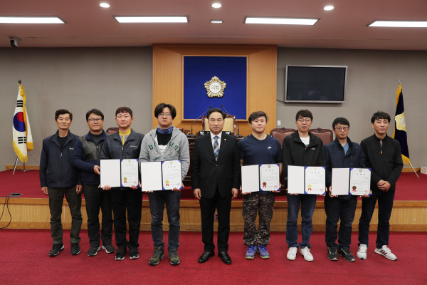 | ▲ 이백균 강북구의장(가운데)이 우수 환경미화원 5명에게 표창장을 전달한 뒤 기념촬영을 하고 있다. (사진제공=강북구의회) | ||