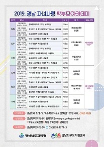 경상남도교육청(교육감 박종훈)은 학부모를 대상으로 ‘2019년 경남 자녀사랑 학부모아카데미’를 5, 6월 창원 등 6개 지역에서 운영한다.