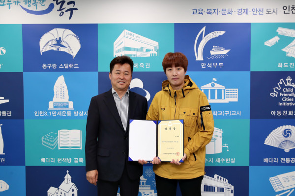 인천 동구는 7일 체계적인 훈련과 경기력 향상을 위해 인천광역시청 소속 태권도 선수로 활동했던 이혜영 코치를 구청 여자태권도부 코치로 임용했다. 사진은 이날 임용식에서 허인환 구청장(왼쪽)과 이 코치가 기념촬영을 하는 모습. (사진제공=인천 동구청)