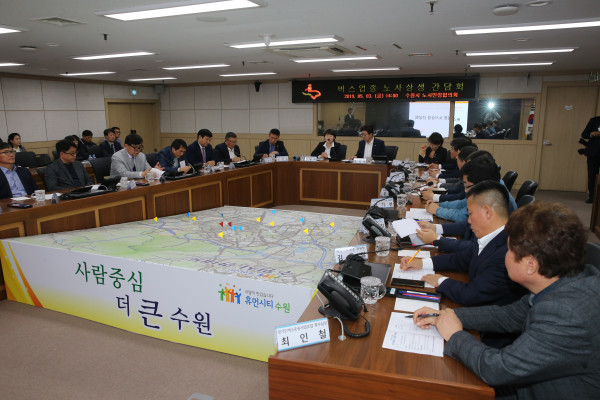 [수원=임종인 기자] 경기 수원시의회가 최근 시청 재난안전상황실에서 열린 '버스업종 노사상생 간담회'에 참석해 주 52시간 근무제 도입에 따라 예상되는 문제점의 대책을 논의했다.