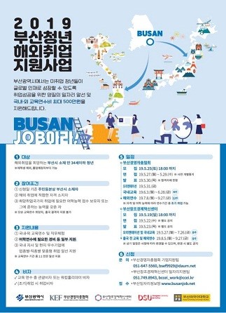 부산시(시장 오거돈)는 글로벌 인재 양성을 위한 ‘2019년 부산청년 해외취업 지원사업’을 추진하며, 5월 25일까지 참여할 청년을 모집한다고 밝혔다.