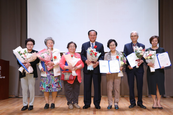 8일 서울 마포노인종합복지관에서 제47회 어버이날을 기념해 ‘마포 카네이션 축제’가 열렸다. 유동균 구청장은 이날 귀감이 되는 효행자 및 단체에게 표창을 수여했다. 사진은 유 구청장(가운데)과 표창장 수여자들이 기념촬영을 하는 모습. (사진제공=마포구청)