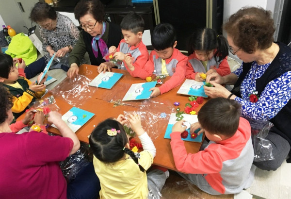 서울 용산구 이태원2동 주민센터가 8일 노인·청소년·어린이가 함께 어울리는 ‘세대공존’ 행사를 개최했다. 이날 행사에서는 어버이날을 맞아 카네이션 벽시계를 만들었다. 사진은 행사에 참여한 노인과 아이들이 카네이션 벽시계를 만드는 모습. (사진제공=용산구청)