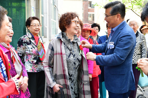 8일 오전 류경기 서울 중랑구청장(오른쪽)이 '어버이날'을 맞아 구립중화경로복지관에서 진행한 ‘효 나눔마당’ 행사에 참여해 노인들에게 카네이션을 달아주고 있다. (사진제공=중랑구청)