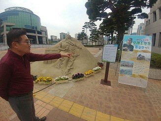 ‘모래조각 작품을 전시하면서’라는 제목으로 시작하는 김 시장의 글은 ‘여기 곧잘 부서지는 모래로 곧잘 무너지는 우리 삶을 쌓아 올렸습니다’라는 첫문장을 통해 모래와 우리 삶을 간접적으로 은유하고 있다.