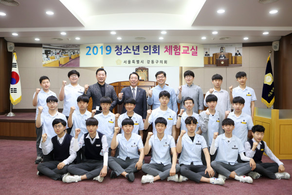 | ▲ ‘2019 청소년 의회 체험교실’에 참여한 배재중학교 학생들과 임인택 의장 및 박원서 의회운영위원장이 기념촬영을 하고 있다. (사진제공=강동구의회) | ||